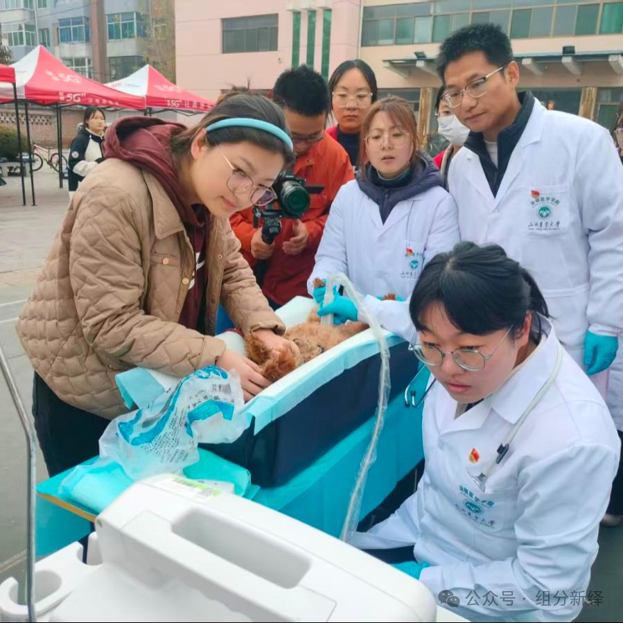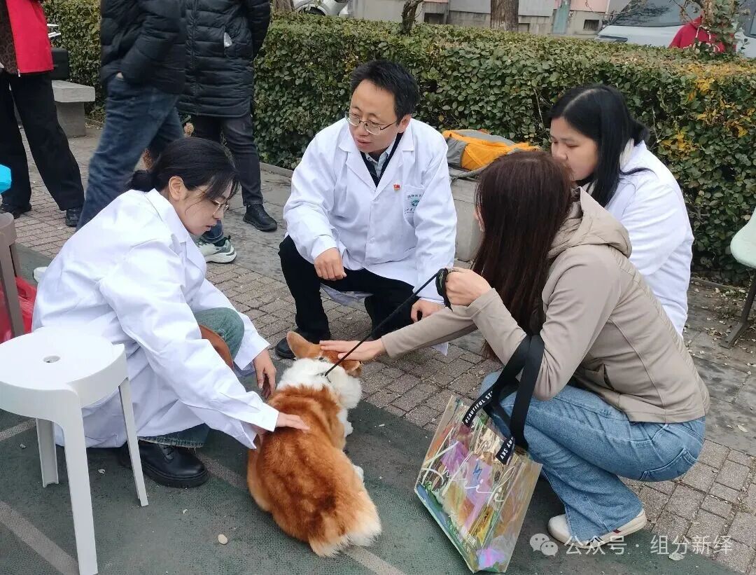 11月5日上午,在山西农业大学家属院老年活动中心广场,由山西农业大学动物医学学院党委主办,动物医学学院教工第二党支部、硕士研究生第五党支部联合承办了一场充满爱心与关怀的宠物义诊活动。本次活动以“红色领航·暖心相伴”为主题,旨在为社区内的宠物及宠主提供免费的健康检查和专业的宠物健康咨询。