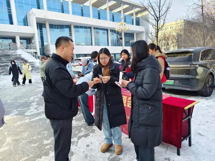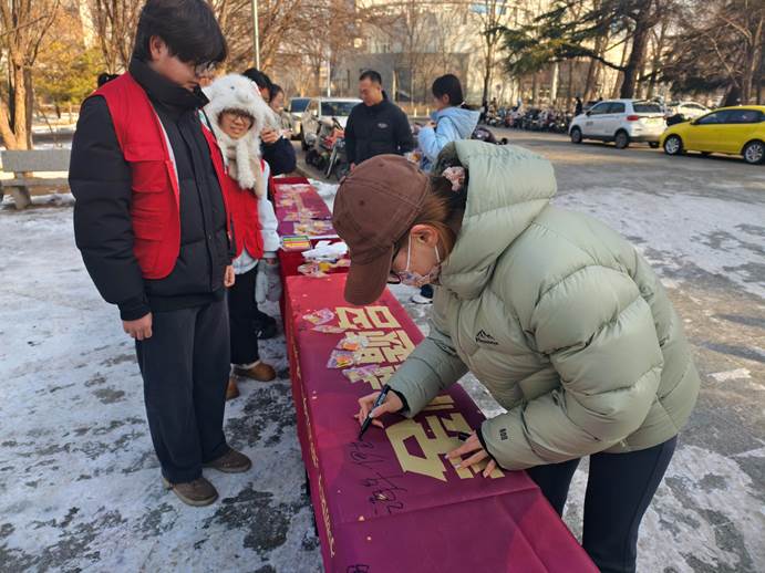 学院毕业生辅导员翟家慧、崔豪豪和新生辅导员海车·伊斯哈尔带着手签祝福贺卡与定制钥匙扣,前往图书馆、勤学楼四五层教室慰问考研冲刺阶段的学子,为学子送上“金榜题名”主题签名旗,学子们纷纷提笔签下祝福语,字迹交织成青春期许,不少同学在签名时互相鼓励,笑着预祝彼此“成功上岸”。辅导员和志愿者们逐一为同学递上写有“前程似锦”“研途顺利”的贺卡,钥匙扣上的“金榜题名”标识也让大家备受鼓。