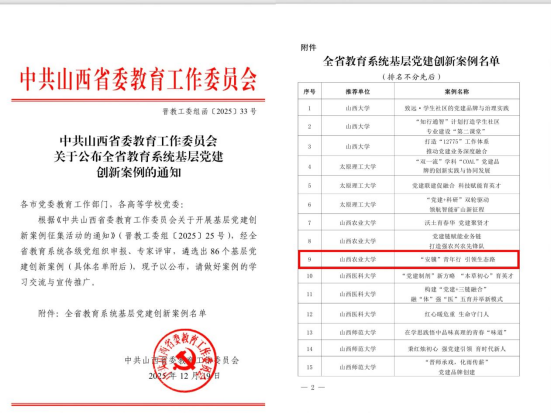 近日,山西省委教育工委发布了《关于公布全省教育系统基层党建创新案例的通知》,我院报送的《“安骥”青年行 引领生态路》成功入选。