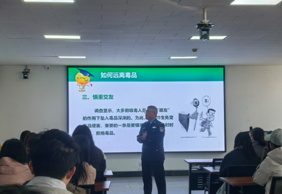 张俊和围绕毒品真相、毒品危害以及当前禁毒形势等内容展开讲解,用真实案例揭露新型毒品的伪装陷阱,细致剖析毒品对个人健康、家庭幸福与社会稳定的严重危害,引导学生认清毒品隐蔽性、迷惑性与危害性。结合青年学生特点,张俊和重点传授实用拒毒技巧,提醒大家谨慎交友、远离复杂场所、提高辨别能力,坚决对毒品说“不”。他的讲解深入浅出、案例鲜活,让在场学生深受触动。